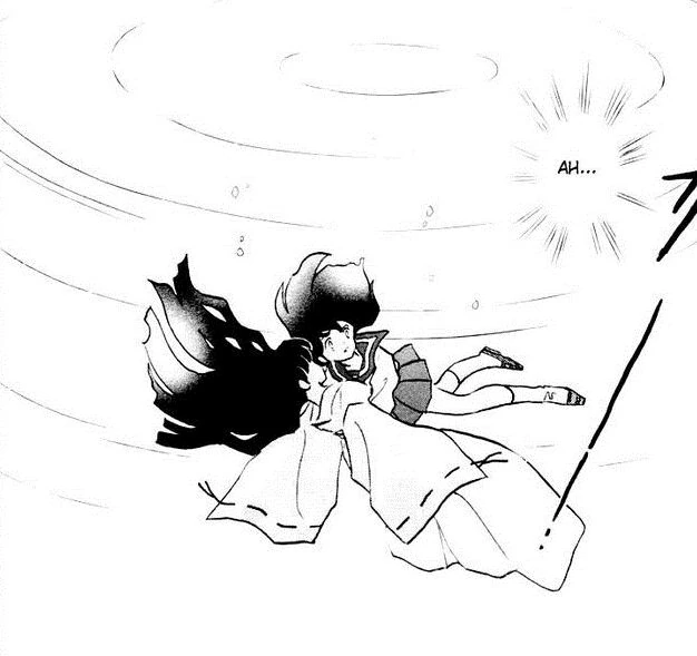 When Kagome steps into the water where Kikyō is, her skin burns because of the miasma corroding the water. She reaches down to touch Kikyō, but both of them get pulled deep underwater. Kagome is even further concerned when she sees so much poison leaking from Kikyō's wound floating around in the water.