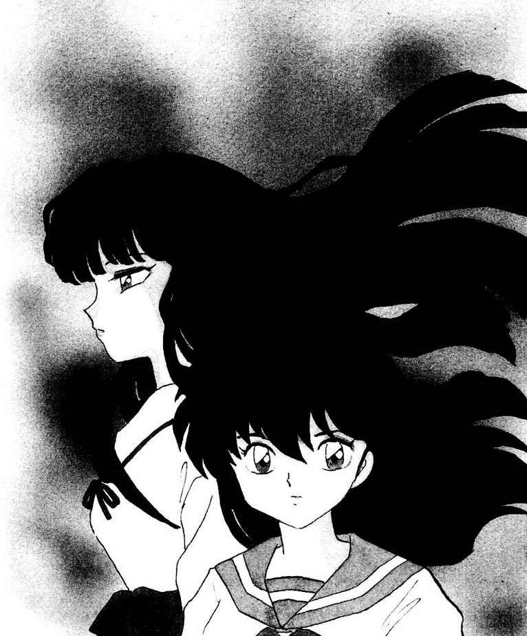 As Kikyō leaves, she thinks to herself that Kagome had no hesitation to save her. If she had any doubt whether or she wanted to, the hole in her chest would not have healed and the miasma would not have been purified. She also notes that her wound still feels warm from Kagome's touch.