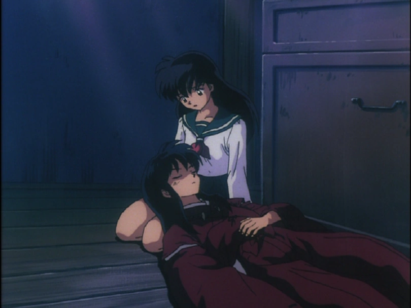 In the forest, Kagome is shocked to see that Inuyasha has become human. Inuyasha tells them that he can't help them while he is in human form. When Kagome asks how he has become human, Myōga tells them that every half demon has a short period every month where they lose all of their demonic powers; Inuyasha's is during the new moon. Kagome is clearly hurt and surprised that Inuyasha didn't tell her this information. Inuyasha tells her that he has been on his own for so long that he doesn't know how to trust anyone. Kagome starts to cry saying how she wishes he would open up to her a little more before yelling at him them that he's going to pay big time for what he did; causing the two to fight. Shippō, during this, silently thinks that he is the only one who can protect them now when he hears a rustle; he gets scared when Nazuna comes out and urges them to come to the temple to aid the priest. Inuyasha declines the offer, but Kagome remembers that her bag is still in there and clearly becomes anxious. Inuyasha blows her off telling her to get a new on when they go back, but she confesses to him that the Sacred Jewel shards were in there as well, which alarms him. Inuyasha then lend the sword's sheath to her in order to protect her when they go back to retrieve the shards. Inuyasha grabs Shippō and they head back to the temple.