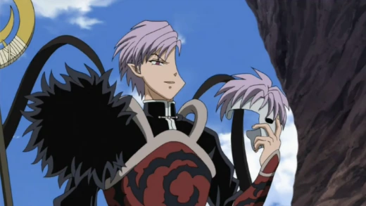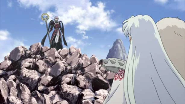 Elsewhere in a ravine, Inuyasha's group follows after Kohaku's shard; Inuyasha can smell Sesshōmaru as well. Though this makes it harder for Naraku to complete the Shikon no Tama, Sango is worried. Ahead, Sesshōmaru's group is lead by the boy, with Jaken asking if his master knows them; this is not the case. Jaken then wonders if Sesshōmaru has suspected this a trap; promising a secret about Tenseiga is a bait too juicy to resist. Sesshōmaru says he'll slay the boy if that's the case. However, the boy has vanished. A sphere of purple energy comes at them, barely missing; Kohaku and Rin board A-Un while Jaken falls. Sesshōmaru flies up to see the sender of the attack, a slender, black-clad daiyōkai, and the boy. Sesshōmaru tries to destroy their footing with a Meidō while Kohaku rescues Jaken. The daiyōkai notices Sesshōmaru deliberately aimed below them so he can learn about Tenseiga, and comments mockingly. Sesshōmaru demands the stranger reveal what he knows, and the daiyōkai discloses that he fought Tenseiga when the blade was wielded by the Tōga; however, Tensiega "looked different" back then. Jaken yells in anger for the demon appearing so young when he's much older. Sesshōmaru swipes at the daiyōkai with his toxic claws, but his opponent vanishes in a blur of black, so the blast only kills the assistant. The demon tells Sesshōmaru it's a deadly mistake to underestimate him, launching another blast, which barely misses A-Un. Upon striking the cliff, however, the blast is revealed to be a perfectly-circular Meidō Zangetsuha.