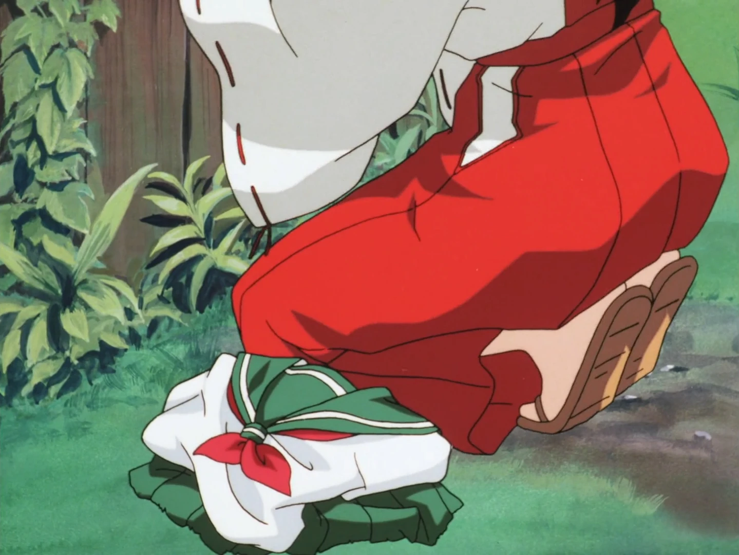- When Kagome is at the well and she's afraid to go back inside it, she let's her school uniform fall to the grass. There we can see for a few seconds it has the ribbon design on the sides we would later see in The Final Act.