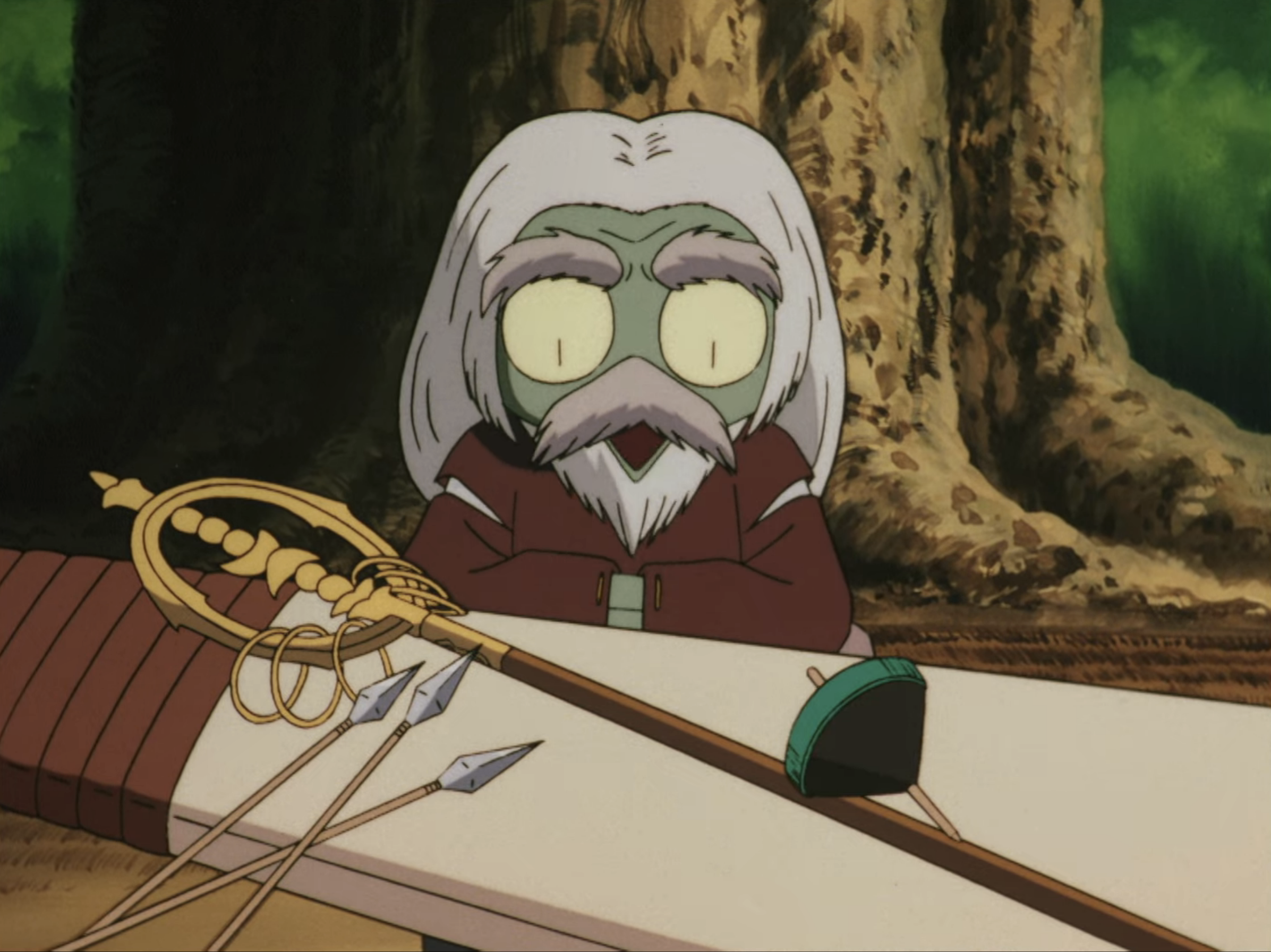 A short while later, Jaken has set up a false sharpener business to take Tessaiga. He cleverly burns an incense to cover his scent to prevent his ruse from being discovered. However, because he offered his sharpening services for free, Kagome, Sango, Miroku and Shippō take him up on the off, leaving the Hiraikotsu, Kagome's arrows, Shippō's spinning top and Miroku's staff behind to get sharpened while they take a walk. Annoyed, Jaken decides that if he sharpens the weapons to perfection, Inuyasha may want to have his sword worked on as well; he gets to work, fervently going about his business.