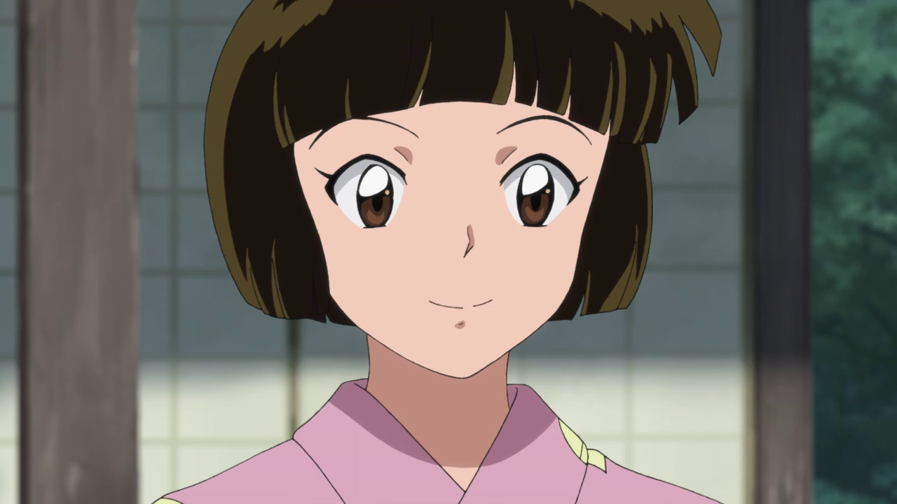 Later, Sango, Kagome, Gyokuto, and Kin'u walk back home as Gyokuto and Kin'u are holding onto Kagome. Sango questions Kagome about the 7 autumnal flowers. Kagome confirms it as it's from the Manyoshu by the poet Yamanoue something or other. Hisui starts crying. Sango tries to comfort Hisui. Gyokuto and Kin'u tell Hisui not to cry. Kagome apologizes to Hisui. Yotsume secretly watches them from a tree. Kagome tells Sango that she knows that she's said this before but Kin'u, Gyokuto, and Hisui all have very unique names. Sango tells Kagome it was Miroku's choice.