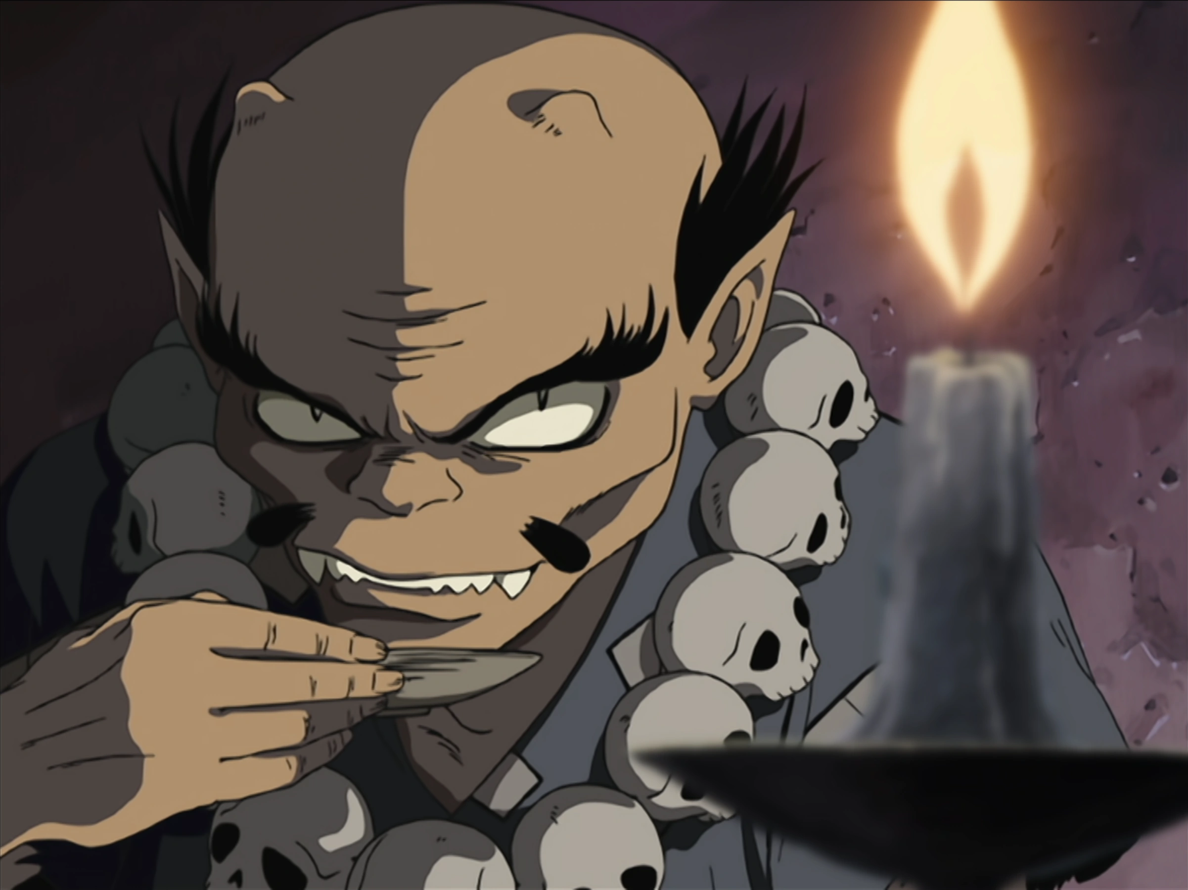 He wears a blue short-sleeved kosode that has a pattern of white arrows and a dark gray hakama. He has a necklace made from skulls that are obviously ten children's who were once murdered to create a sword: in many legends, oni are said to eat children.