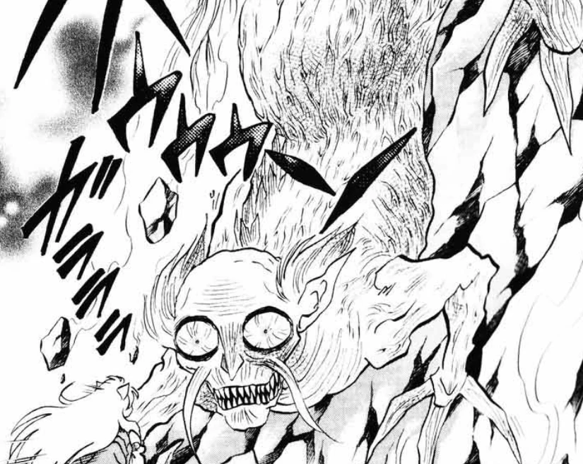 Nikosen was previously a monk who started absorbing the life force from trees to extend his life and thus stay an immortal. In the process, he underwent a substantial physical transformation, taking on the appearance of a huge beast with a body made of wood and face of an old man. By slaying Nikosen with the Dragon-Scaled Tessaiga, Inuyasha managed to absorb his holy aura and counter the backlash of yōki.